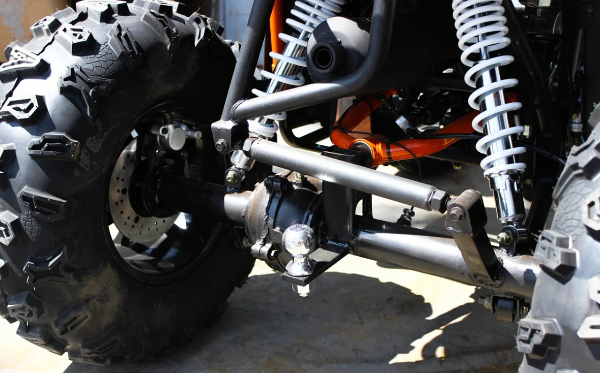 Передняя часть квадроцикла усилена в виде несущего бампера ,идущего по контуру всего квадроцикла и крепится к несущей раме, сделано это для жёсткости несущей конструкции при преодолении серьёзных препятствий и уклонов дороги.