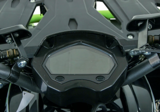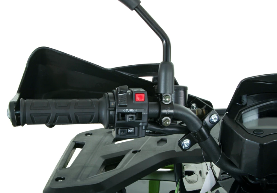 Комплектуется: электронной приборной панелью, имеет защиту рук, родительский контроль, шприцуемую подвеску, поворотники, пластиковые накладки на колеса, датчик уровня топлива, спинка, зеркала, подогрев ручек.