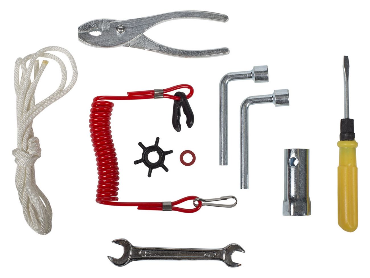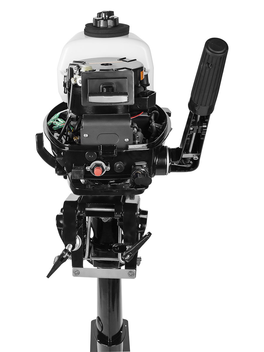 Мотор запускается ручным стартером, а управляется стандартным румпелем с поворотной ручкой газа (гашеткой мотоциклетного типа) с антипроскальзывающими насечками.