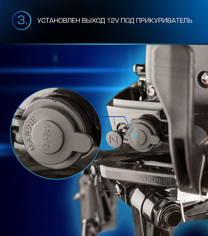 Подзарядка электронных устройств доступна прямо от работающего мотора. Мотор оснащен полным «электропакетом», включая в себя: