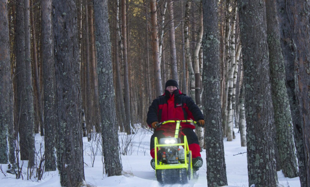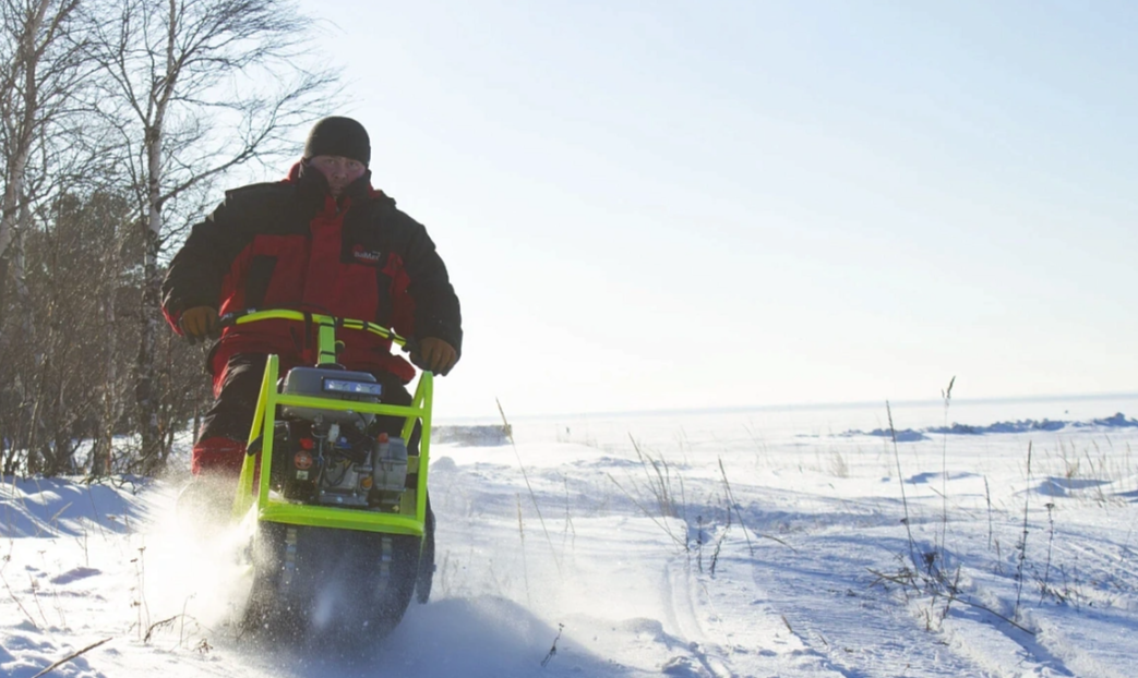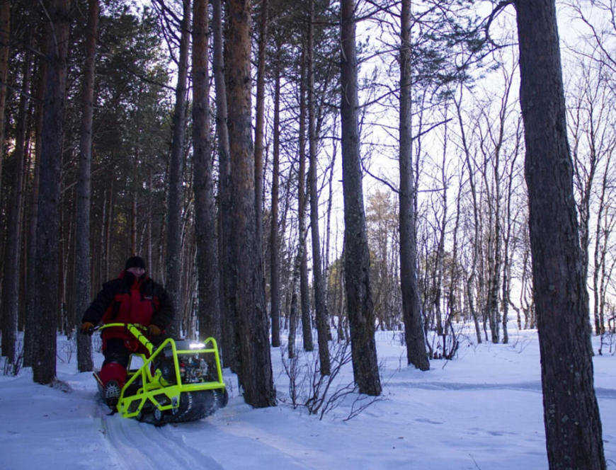 Компактный мотобуксировщик на 380 гусеницы в комплект которого входит модуль с санями, который делает управление данного мотобуксировщика легким и комфортным.