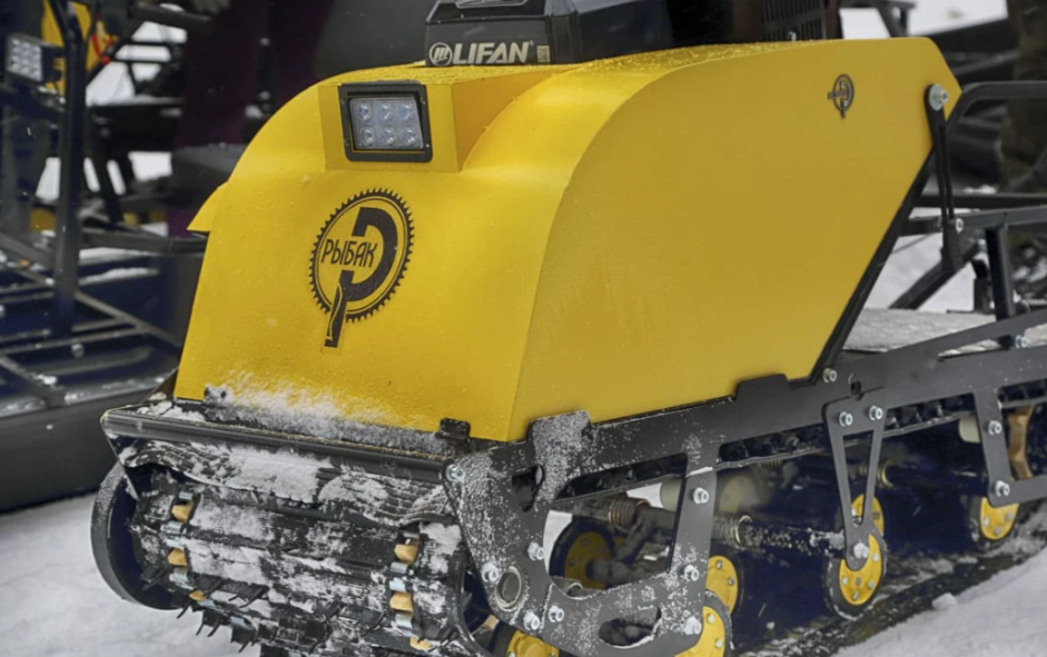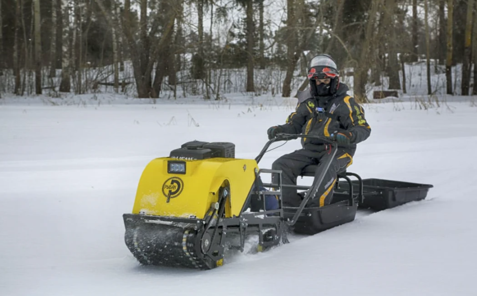 В конструкции мотовездехода используется цельная резиновая гусеница Composit шириной 500 мм. Гусеница в сочетании с катковой подвеской способна проходить спокойно по льду и даже по территории без снега..