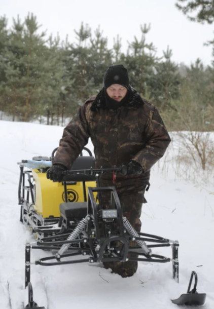 Буксировщик оснащен 4-х тактным двигателем мощностью 9 л. с., достигающий скорость до 40 км/ч. Это позволяет быстро перевозить груз до 300 кг в санях и на специальной багажной площадке мотобуксировщика. Объем двигателя составляет 270 кубов.