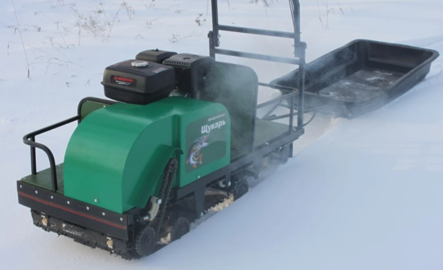 Передний привод для глубоко снега. Мотобуксировщик с двигателем 15 сил не уступает и более мощным двигателям по скорости и проходимости, но зависит на объем перевозимого веса. Катковая подвеска подойдет как для зимней езды, так и для летних покатушек. Гусеница с хорошим грунтозацепом и не просто будет её порвать или стереть. Задняя часть мотобуксировщика для перевозки вещей.- Производитель Щукарь