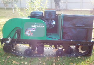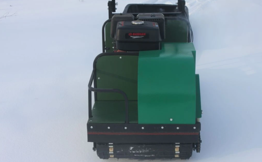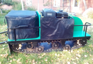 Передний привод для глубоко снега. Мотобуксировщик с двигателем 15 сил не уступает и более мощным двигателям по скорости и проходимости, но зависит на объем перевозимого веса. Катковая подвеска подойдет как для зимней езды, так и для летних покатушек. Гусеница с хорошим грунтозацепом и не просто будет её порвать или стереть. Задняя часть мотобуксировщика для перевозки вещей.