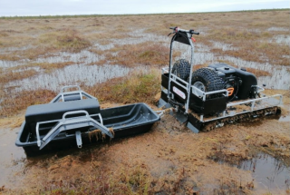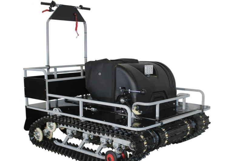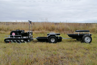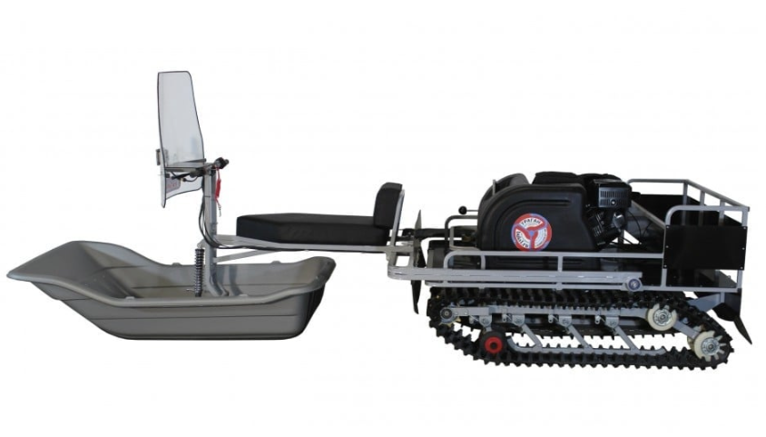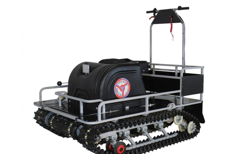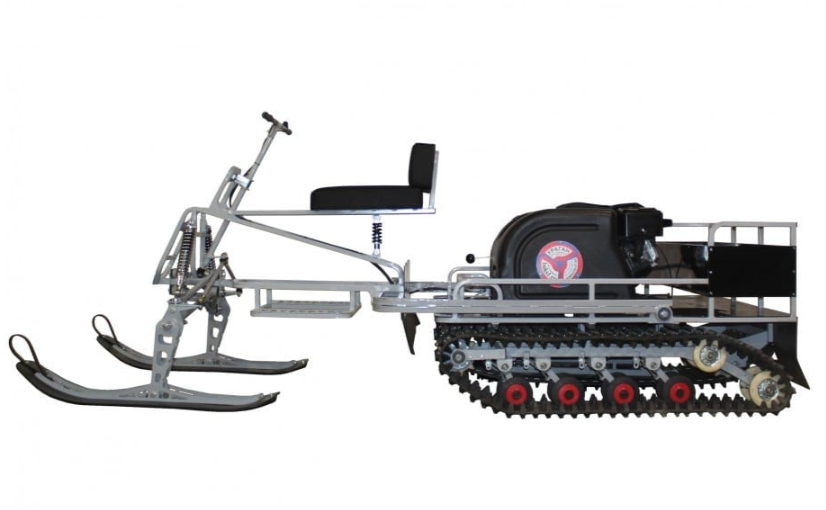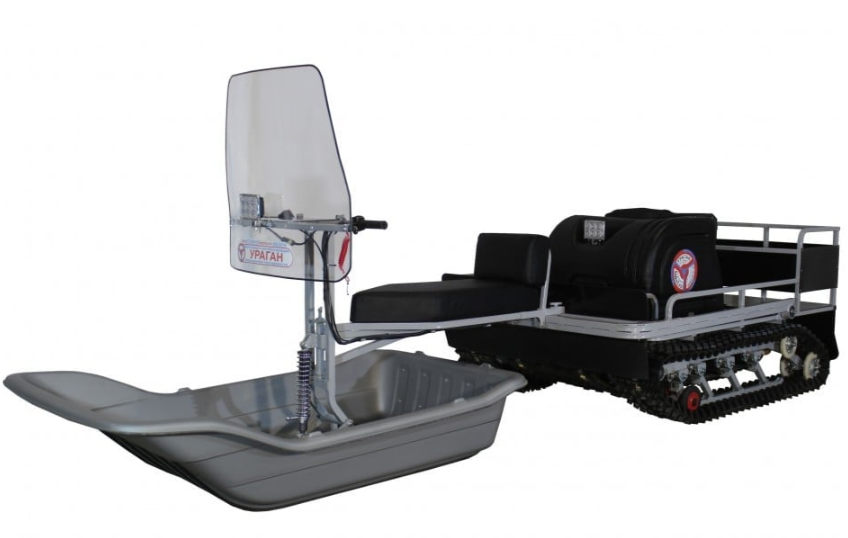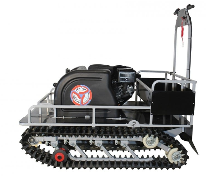 Всесезонный буксировщик сверхвысокой проходимости УРАГАН МЕДВЕДЬ 20 лс, рассчитан на нагрузку по сильному бездорожью до 400 кг, по очень глубокому снегу - до 250 кг, максимальная скорость - 32 км/ч, предназначен для езды по большинству направлений (глубокий снег, топкое болото, колеи, бревна и каменные гряды). Независимая подвеска с большим ходом - мягко обволакивает все неровности, что увеличивает проходимость. Безопасный угол преодолеваемого подъема - 60 градусов.Для улучшения и облегчения управляемости по неровностям средняя гусеница приподнята, поэтому напряжение от управления на болоте и неровностям Медведе ниже, чем на обычном буксировщике. Площадь контакта с поверхностью у 3-х гусениц Медведя на 10% больше Бурана. Все подшипники ходовой защищены от попадания воды и грязи. На средней гусенице установлена система самоочистки от сырого снега и грязи. Силовые модули подходят от обычного среднемоторного Урагана. Расчетная нагрузка на багажник - до 80 кг. Длина 1499 мм. Ширина 1000-1120 мм. Ширина гусениц 820-940 мм. Вес 180-185 кг.