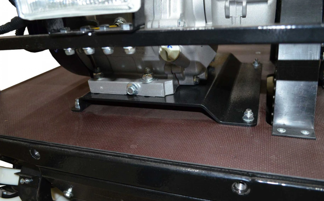Двигатель с редуктором расположены по центру в передней части, на специальной стальной станине, надежно закрепленной к раме. Данное расположение силового агрегата, позволяет удачно сбалансировать центр тяжести, что положительно сказывается на удобстве управления буксом и создает большое багажное пространство для различных вещей, инструмента, провизии.