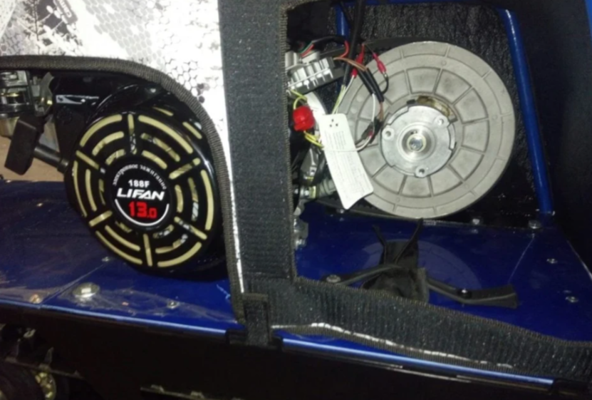 Буксировщик оснащен 4-х тактным двигателем мощностью 13 л. с. и объемом 389 кубов, достигающий скорость до 50 км/ч. Это позволяет быстро перевозить груз до 50 кг на специальной багажной площадке мотобуксировщика. Также есть возможность установить сани к мотобуксу, что позволит перевозить дополнительно до 60 кг.